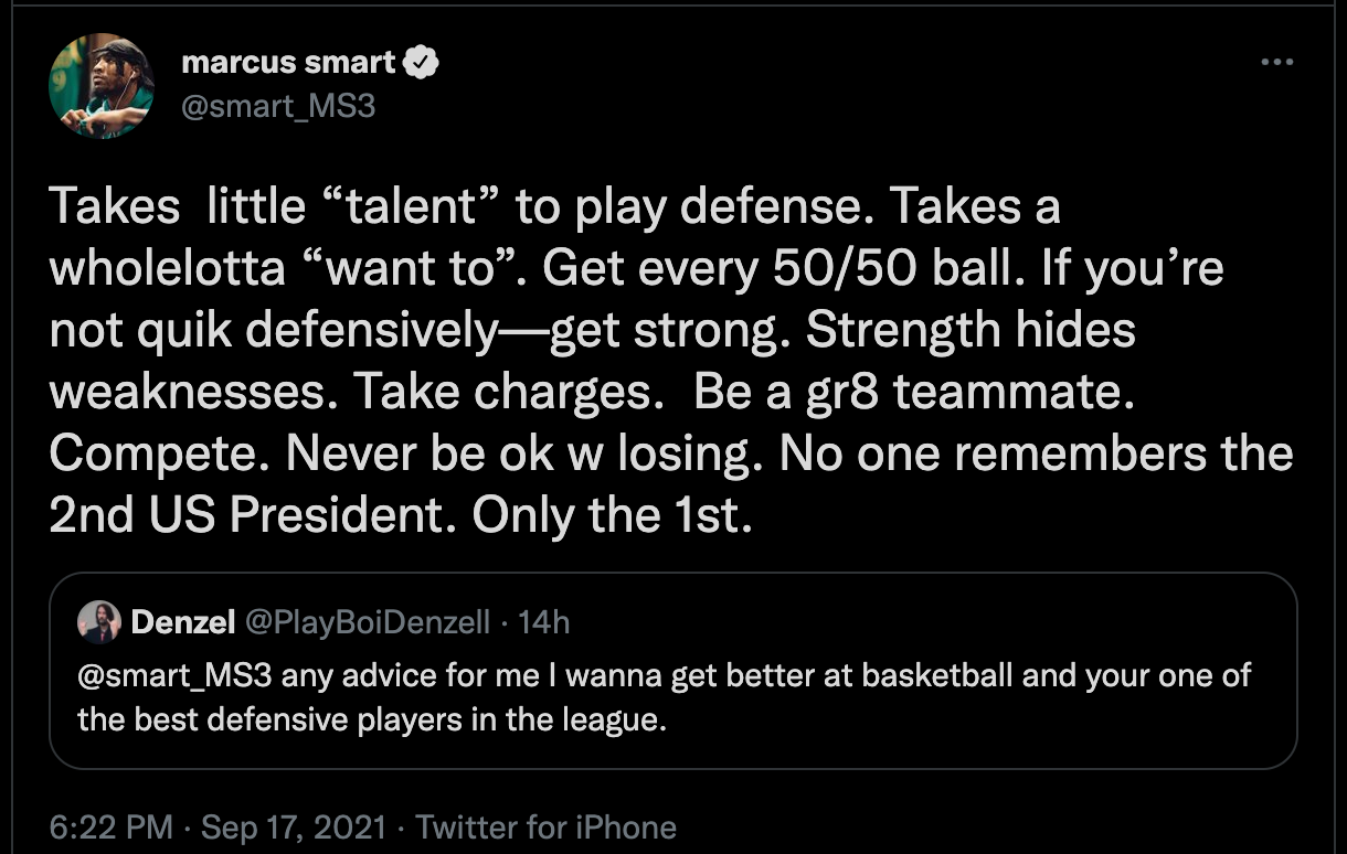 Smart was asked by a fan on Twitter for advice about getting better at basketball since he is considered to be one of the better defenders in the NBA. The two-time All-Defensive Team selection tried to send a motivational tweet, but it appeared to backfire.