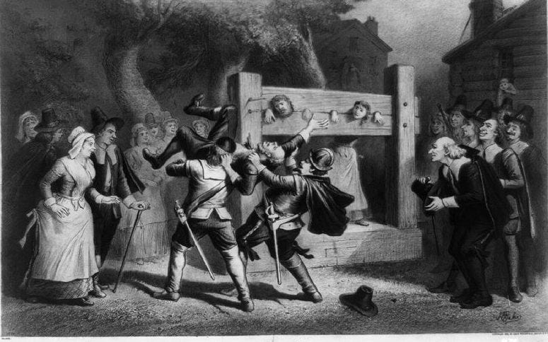 In the name of the “common good,” the Puritans permitted burning at the stake for cases of petty treason, which they defined as the killing of masters by servants. No fewer than two people were burnt alive in the Bay province during the seventeenth century. “Common good” Massachusetts also recognized a baker’s dozen of capital crimes that were punishable by hanging, including witchcraft, idolatry, blasphemy, homicide, rape, adultery, bestiality, sodomy, false witness with intent to take life, and adult children who were “stubborn” or “rebellious.” No adult child was ever executed in New England for disobeying a parent, but several in their forties were whipped by order of the courts for being rude or abusive to their progenitors.
