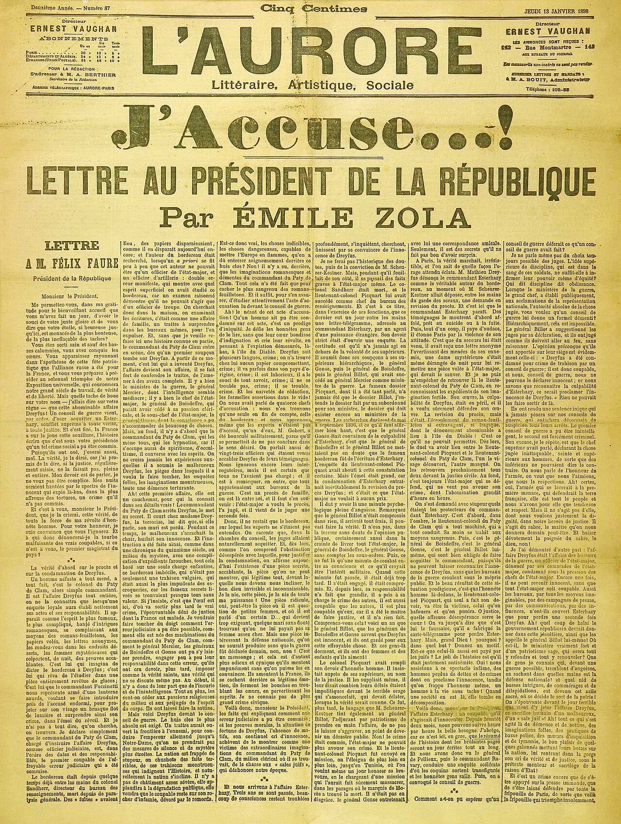 Dreyfus’s fortunes changed in 1898 when the great French novelist Émile Zola took up his defense. Zola published an open letter to the President of France, which was a full-throttled defense of the innocent Dreyfus and a devastating critique of the French justice system. As a result, the so-called “Dreyfus Affair” became an international cause célèbre that rocked the Third French Republic for over a decade. Dreyfus was subsequently pardoned in 1899 and fully exonerated in 1906.