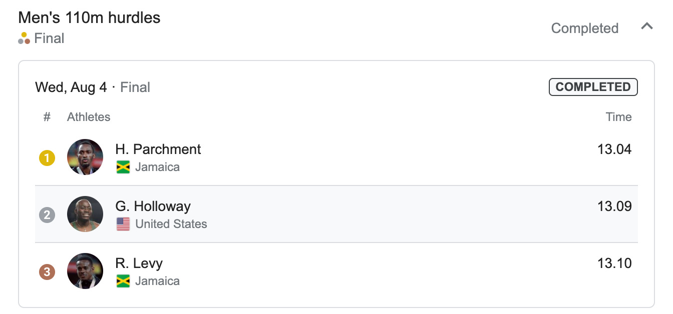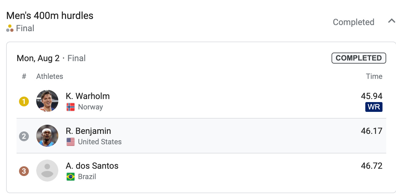 The 400 meter hurdles world record was set by American Kevin Young about 29 years ago. His world record was 46.78. About a month before the Olympics, Norwegian Karstom Warholm broke this long standing record, running 46.7. At the Olympics, it was expected that Warholm and American Rai Benjamin would compete for first and second place, and that's what happened. Warholm shattered his previous world record, running 45.94. Rai Benjamin also broke Kevin Young's previous world record and Warholm's recent previous world record, running 46.17. It's very unusual for a world record to be broken by this much at a short distance, let alone by two people. Benjamin ran the second fastest time in history and still placed second at the Olympics. Benjamin later ran an outstanding final leg on the men's 4 x 400 relay, which the U.S. won. So is the fact that Benjamin placed second in the Olympics by running the second fastest time ever somehow a sign of decline in U.S. men's track and field? I don't think so. Benjamin has faster times at the 100 meter, 200 meter, and 400 meter sprints than Warholm, but Warholm is incredibly strong in the 400 meter hurdles. It's expected that Warholm and Benjamin will continue their rivalry and people think more world records from either of them are possible. As I've said before, this Olympics could just be a sign that other countries in the world are catching up with U.S. men's track and field. It's easy to compile lists like this in attempt to prove the point you want to make. It takes more time and effort to present a more balanced and nuanced picture. I don't know if Mr. Doom and Gloom considers the 400 meter hurdles in his top tier of athletic ability in his pompous list of athletic ability, but if he's ever run the 400 meter hurdles he'd know it's an extremely demanding event.